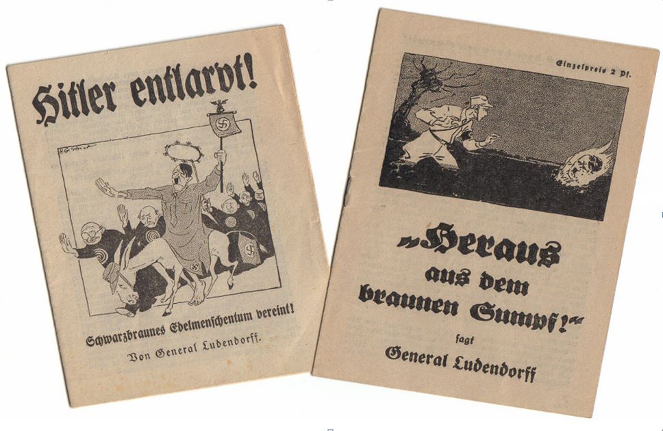 General Erich Ludendorff hatte nach dem Ende des Ersten Weltkriegs kurzfristig bei der Abwehr der Folgen des Versailler Vertrages mit Hitler zusammengearbeitet. Als Ludendorff Hitlers Ziele erkannte, trennte er sich 1925 von ihm. Erich Ludendorff war nie Mitglied der NSDAP. Er führte insbesondere ab 1929 einen unentwegten geistigen Abwehrkampf gegen die drohende Nazi-Diktatur. Dies belegen zahlreiche und weit verbreitete Artikel von Erich Ludendorff, z.B.: „Neuer Trug der NSDAP“, „Gewalttätige Unterführer“, „SA-Hetze“, „NS-Zynismus“, „Nationalsozialisten als Würger“, „Hitlers Verrat“, „Heraus aus dem braunen Sumpf“, „Wer wählt, wählt den Zuchthausstaat.“.
